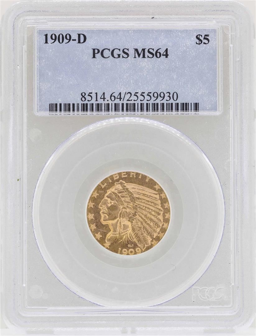 One 1909-D $5 Indian Head Half Eagle Gold Coin PCGS MS64. PCGS Graded.