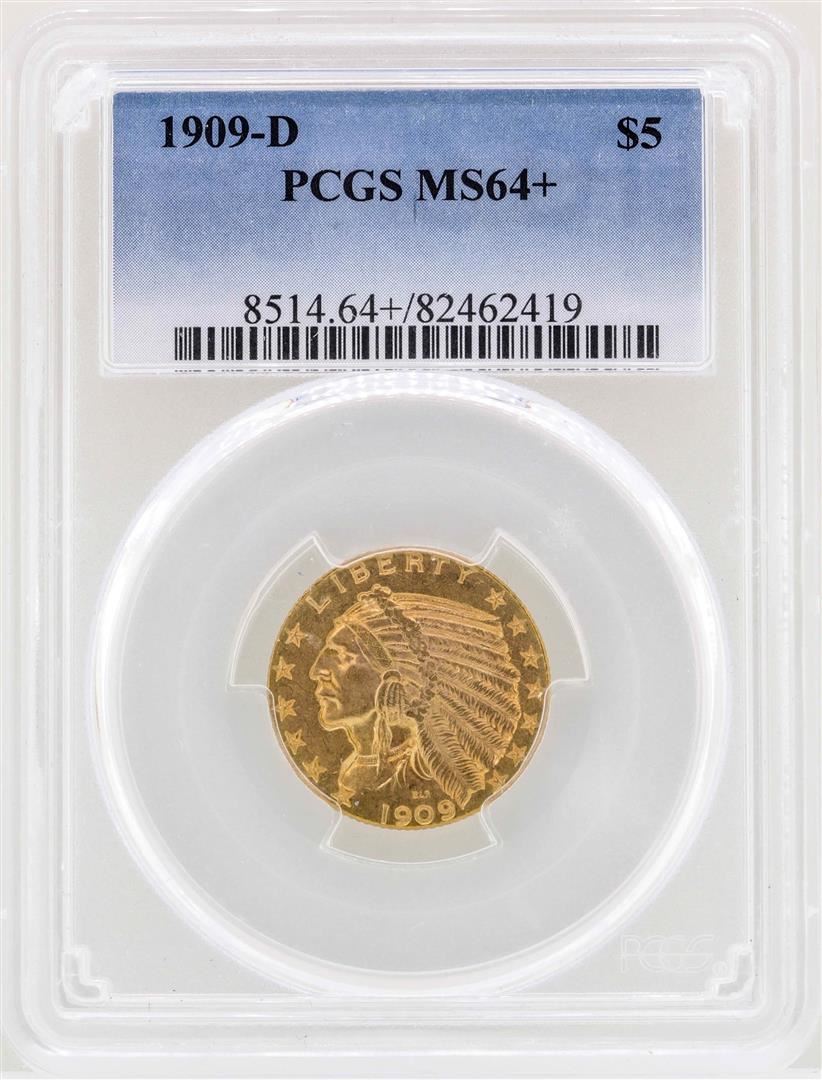 One 1909-D $5 Indian Head Half Eagle Gold Coin PCGS MS64+. PCGS Graded.