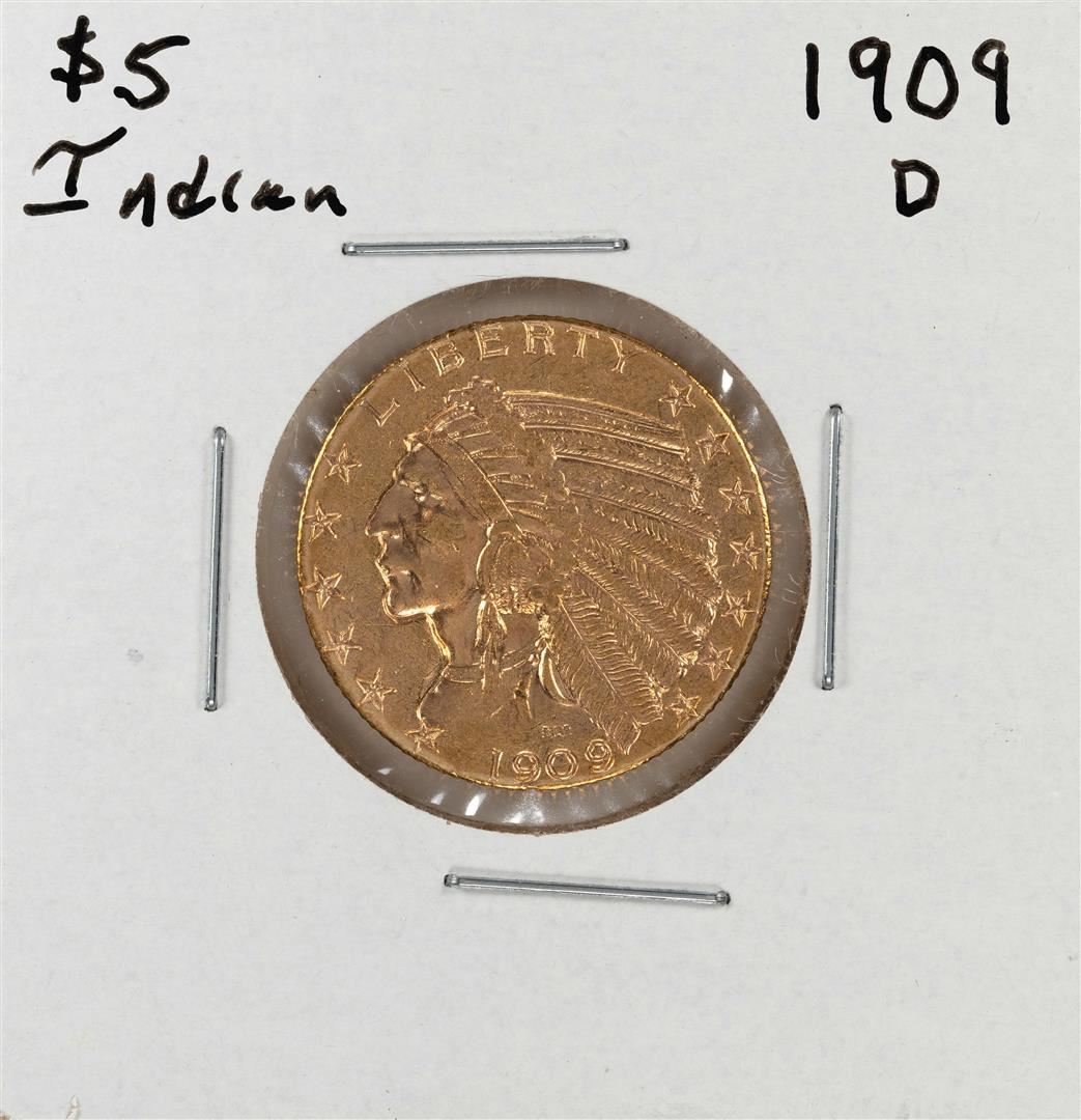 One 1909-D $5 Indian Head Half Eagle Gold Coin.