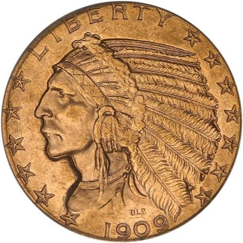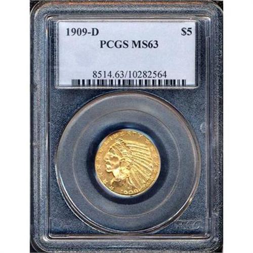 <b>1909-D $5 Indian. PCGS graded MS63.</b> More often than not frosty for the issue, as seen here, the sleek golden surface is nearly MS64 level with few distracting bagmarks <b>(PCGS # 8514)</b> <i>