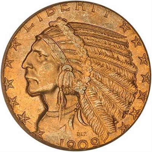 Has one light hairline through the upper portrait, but otherwise fresh, lustrous, with attractive orange gold toning. While the 1909-D is the most plentiful isssue in the Indian series, it tends to be found only MS60 to MS63 at best from roll hoards. Only an occasional MS64 or higher coin makes it way to auction.