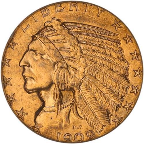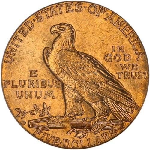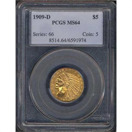 <b>1909-D $5 Indian. PCGS graded MS64.</b> A satiny gold gem with strong underlying luster including the smooth contour of the Indian's cheek, plus delightful overall eye appeal. Most plentiful date in the series <b>(PCGS # 8514)</b> <i>