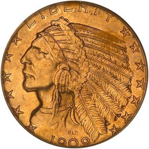 A satiny gem with energetic bright golden cartwheel luster and light reddish orange toning that seems to want to motivate bidders to increase their bids as though by subtle hypnotism! This is one of the more attractive 1909-D's graded thus far, and a sure bet that it'll draw a large crowd when it goes on the auction block. The interesting Indian head series of $5 gold was struck using a unique style known as "recessed relief" whereby the design is still in normal coin relief, but sunken or recessed below the normal field of the coin. Indian $5 gold pieces of this type were struck from 1908 until 1929.