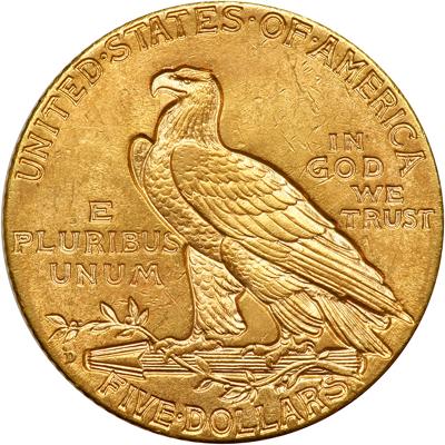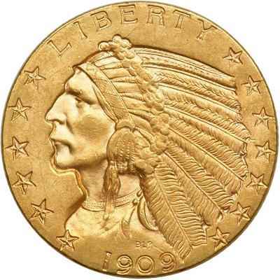 1909-D $5 Indian. MS-60 Plus. Frosted luster with normal bagmarks.