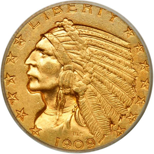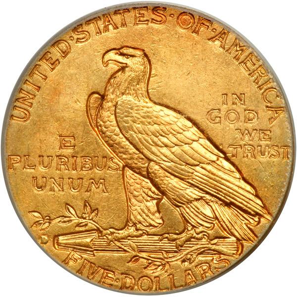 1909-D $5 Indian. PCGS graded MS-62 PQ. Well struck with lovely golden toning on both sides. Should be sent back to PCGS for a MS63 grade (PCGS # 8514) .