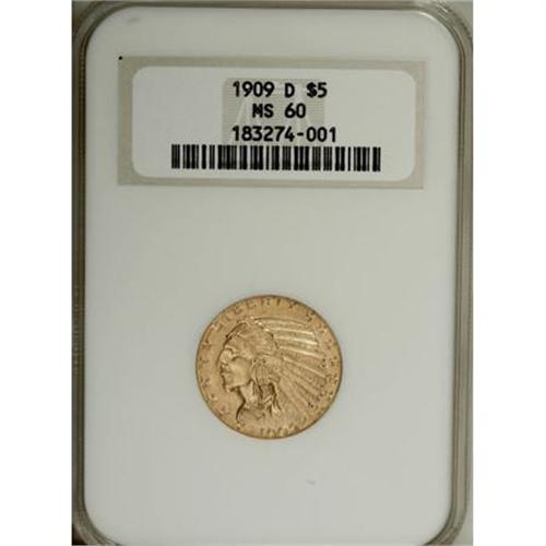 <B>1909-D $5 MS60 NGC.</B></I> NGC Census: (620/19412). PCGS Population (730/20459). Mintage: 3,423,560. Numismedia Wsl. Price for NGC/PCGS coin in MS60: $420. (#8514)<BR><BR><B>Coin Engraver:</B> Bela Lyon Pratt<BR><BR><b>Shipping:</b> Coins & Currency (<a target="_blank" href="http://www.heritageauctions.com/common/shipping.php">view shipping information</a>)