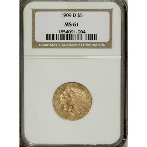 1909-D $5 MS61 NGC. NGC Census: (3626/14475). PCGS