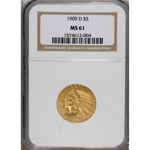 1909-D $5 MS61 NGC. NGC Census: (7296/29038). PCGS