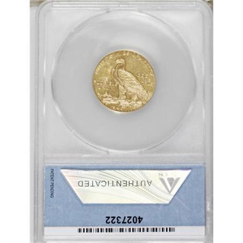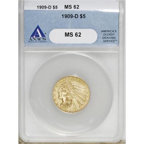 <B>1909-D $5 MS62 ANACS.</B></I> A satiny Mint State piece with pleasing light yellow surfaces and full mint brilliance.<BR><BR><B>Coin Engraver:</B> Bela Lyon Pratt<BR><BR><b>Shipping:</b> Coins & Currency (<a target="_blank" href="http://www.heritageauctions.com/common/shipping.php">view shipping information</a>)