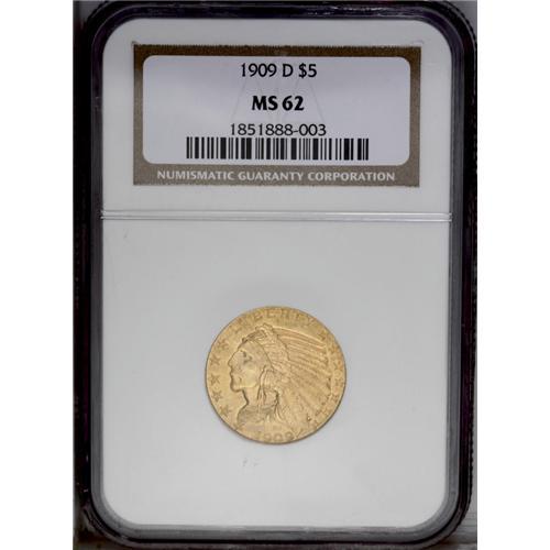 1909-D $5 MS62 NGC. A lustrous and boldly impressed pi