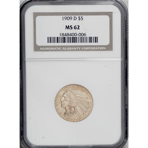 1909-D $5 MS62 NGC. An attractive orange-gold piece wi