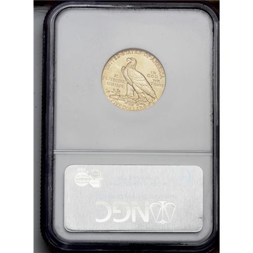 <B>1909-D<$5> MS62 NGC.</B></I> Attractive khaki-gold color and satin luster are evenly distributed across both sides of this boldly struck example. A few trivial field marks define the grade of the piece.
