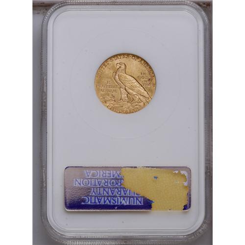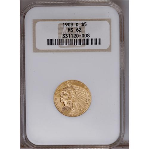 <B>1909-D<$5> MS62 NGC.</B></I> Brassy-gold surfaces exhibit several light marks on the Indian's cheek and in the raised, exposed fields of the left (facing) obverse and upper reverse. The design features are well impressed.