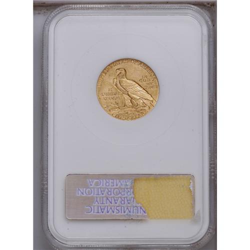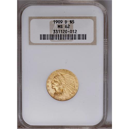 <B>1909-D<$5> MS62 NGC.</B></I> Peach toning fills recessed areas of this sharply struck and moderately abraded older-holder example. Suitable for an Uncirculated gold type set.