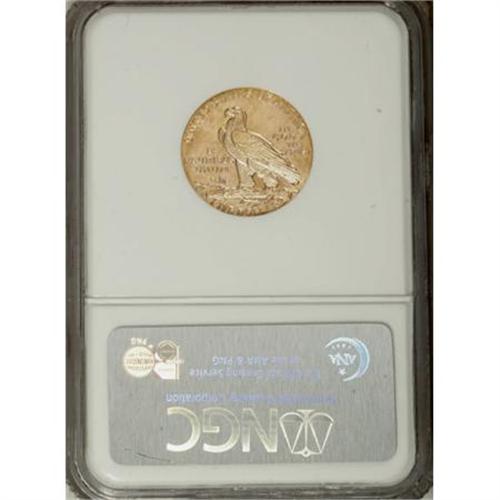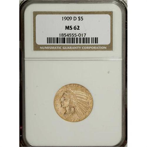 <B>1909-D $5 MS62 NGC.</B></I> This is the most common issue of the popular and widely collected Indian Head half eagle series. The appeal of this example derives from its rich, attractive coloration and satiny mint frost. A number of small marks in the reverse fields limit the grade. <BR><BR><b>Shipping:</b> Coins & Currency (<a target="_blank" href="http://www.heritageauctions.com/common/shipping.php">view shipping information</a>)
