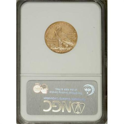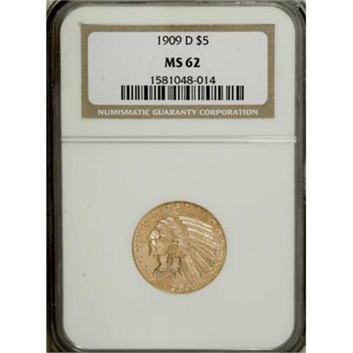 <B>1909-D $5 MS62 NGC.</B></I> NGC Census: (7388/7600). PCGS Population (7349/9752). Mintage: 3,423,560. Numismedia Wsl. Price for NGC/PCGS coin in MS62: $900. (#8514)<BR><BR><B>Coin Engraver:</B> Bela Lyon Pratt<BR><BR><b>Shipping:</b> Coins & Currency (<a target="_blank" href="http://www.heritageauctions.com/common/shipping.php">view shipping information</a>)