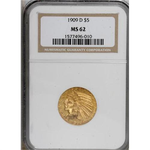 <B>1909-D $5 MS62 NGC.</B></I> Well-defined overall with luminous sun-gold surfaces. A lightly abraded and interesting example of this popular type issue, one of only two Pratt half eagles with a mintage of over a million pieces.<BR><BR><B>Coin Engraver:</B> Bela Lyon Pratt<BR><BR><b>Shipping:</b> Coins & Currency (<a target="_blank" href="http://www.heritageauctions.com/common/shipping.php">view shipping information</a>)