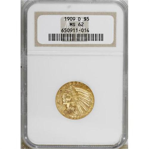 <B>1909-D $5 MS62 NGC.</B></I> NGC Census: (7556/7714). PCGS Population (7562/9981). Mintage: 3,423,560. Numismedia Wsl. Price for NGC/PCGS coin in MS62: $870. (#8514)<BR><BR><B>Coin Engraver:</B> Bela Lyon Pratt<BR><BR><b>Shipping:</b> Coins & Currency (<a target="_blank" href="http://www.heritageauctions.com/common/shipping.php">view shipping information</a>)