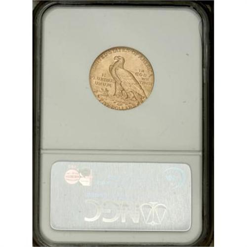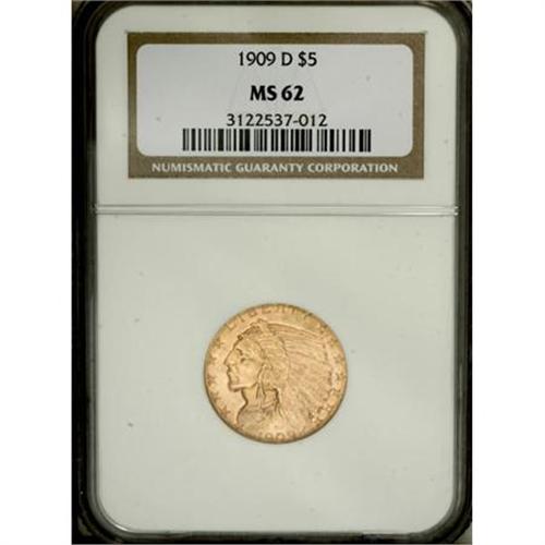 <B>1909-D $5 MS62 NGC.</B></I> NGC Census: (7463/7647). PCGS Population (7498/9943). Mintage: 3,423,560. Numismedia Wsl. Price for NGC/PCGS coin in MS62: $900. (#8514)<BR><BR><B>Coin Engraver:</B> Bela Lyon Pratt<BR><BR><b>Shipping:</b> Coins & Currency (<a target="_blank" href="http://www.heritageauctions.com/common/shipping.php">view shipping information</a>)