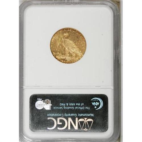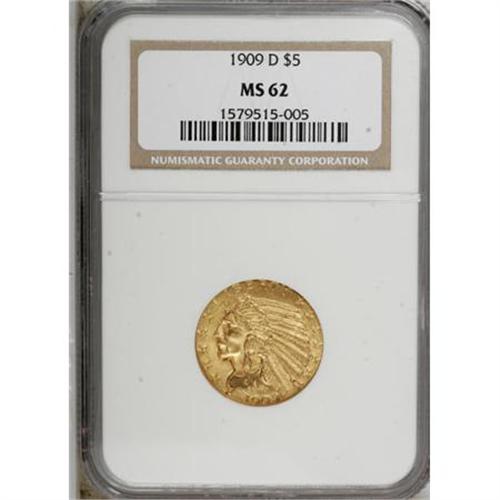 <B>1909-D $5 MS62 NGC.</B></I> . NGC Census: (7649/7796). PCGS Population (7666/10038). Mintage: 3,423,560. Numismedia Wsl. Price for NGC/PCGS coin in MS62: $905. (#8514)<BR><BR><B>Coin Engraver:</B> Bela Lyon Pratt<BR><BR><b>Shipping:</b> Coins & Currency (<a target="_blank" href="http://www.heritageauctions.com/common/shipping.php">view shipping information</a>)