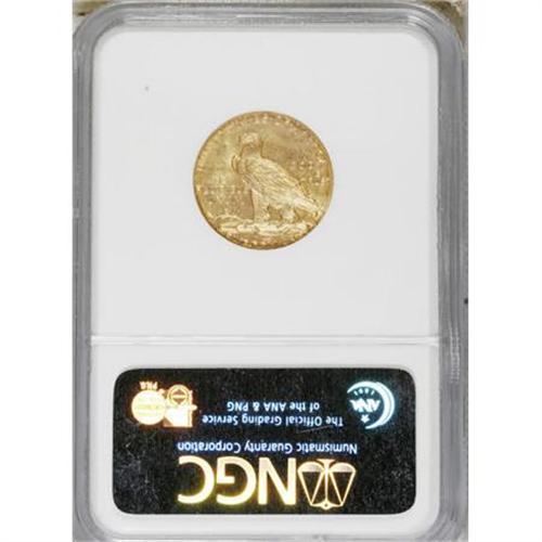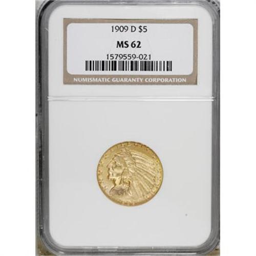 <B>1909-D $5 MS62 NGC.</B></I> . NGC Census: (7649/7796). PCGS Population (7666/10038). Mintage: 3,423,560. Numismedia Wsl. Price for NGC/PCGS coin in MS62: $905. (#8514)<BR><BR><B>Coin Engraver:</B> Bela Lyon Pratt<BR><BR><b>Shipping:</b> Coins & Currency (<a target="_blank" href="http://www.heritageauctions.com/common/shipping.php">view shipping information</a>)