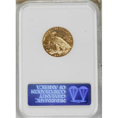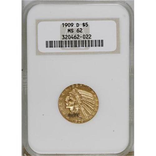 <B>1909-D $5 MS62 NGC.</B></I> NGC Census: (7640/7786). PCGS Population (7789/10107). Mintage: 3,423,560. Numismedia Wsl. Price for NGC/PCGS coin in MS62: $910. (#8514)<BR><BR><B>Coin Engraver:</B> Bela Lyon Pratt<BR><BR><b>Shipping:</b> Coins & Currency (<a target="_blank" href="http://www.heritageauctions.com/common/shipping.php">view shipping information</a>)