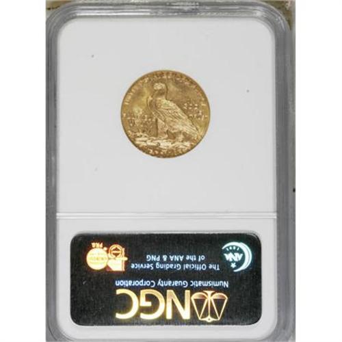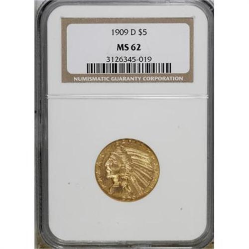 <B>1909-D $5 MS62 NGC.</B></I> NGC Census: (7640/7786). PCGS Population (7789/10107). Mintage: 3,423,560. Numismedia Wsl. Price for NGC/PCGS coin in MS62: $910. (#8514)<BR><BR><B>Coin Engraver:</B> Bela Lyon Pratt<BR><BR><b>Shipping:</b> Coins & Currency (<a target="_blank" href="http://www.heritageauctions.com/common/shipping.php">view shipping information</a>)