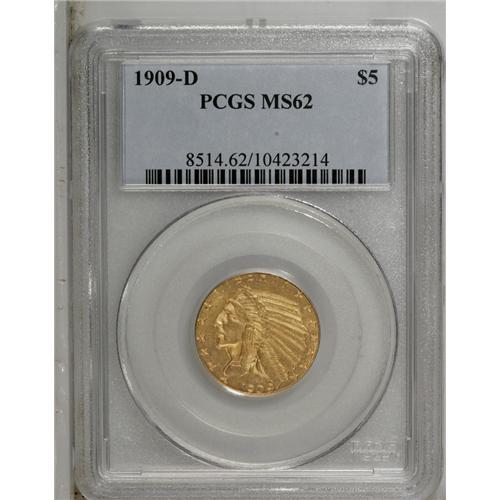 <B>1909-D $5 MS62 PCGS.</B></I> A lustrous honey-gold example, satiny and well struck. The overall eye appeal suggests a higher grade, though closer inspection reveals small marks on the portrait.<BR><BR><b>Shipping:</b> Coin/Currency (<a target="_blank" href="http://www.heritageauctions.com/common/shipping.php">view shipping information</a>)