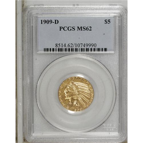 1909-D $5 MS62 PCGS. A well struck and rather brassy e