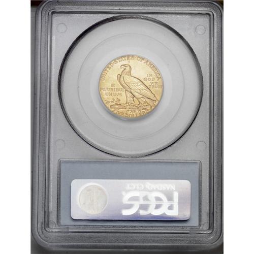 <B>1909-D<$5> MS62 PCGS.</B></I> Bright golden color with some pink highlights in the protected areas. Well defined overall, save for some slight softness on the lowest feather of the headdress.