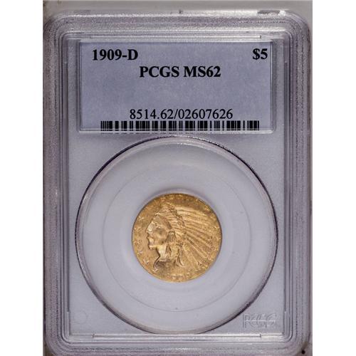 <B>1909-D<$5> MS62 PCGS.</B></I> Honey-gold surfaces exhibit well struck design elements, though the eagle's left shoulder is soft. Light handling marks are scattered over each side.
