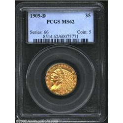 1909-D $5 MS62 PCGS. Lots of luster can't be ignored on either side. If not for the presence of an obverse scratch by the Indian's mouth, this coin would probably grade Choice. Important notice: We expect to be auctioning lots at the rate of 200-250 per hour. Sometimes eBay Premier live bid software cannot keep up with that pace, so we strongly recommend that you place a realistic proxy bid now as insurance to avoid disappointment. Also please note that all Heritage/CAA lots purchased through eBay Premier carry a 20% Buyer's Premium. Please make sure you read the Terms and Conditions.