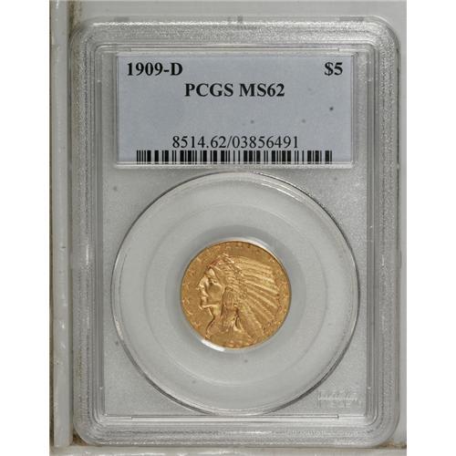 <B>1909-D $5 MS62 PCGS.</B></I> Pink-red hues fill the crevices of the design, while the fields are apricot and lime-green. This satiny and precisely struck gold type coin is pleasantly unabraded.<BR><BR><b>Shipping:</b> Coins & Currency (<a target="_blank" href="http://www.heritageauctions.com/common/shipping.php">view shipping information</a>)