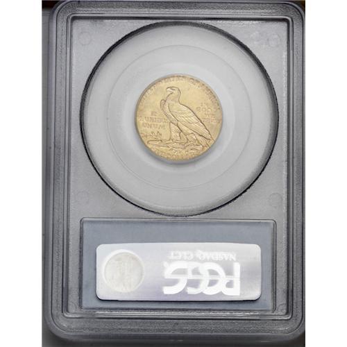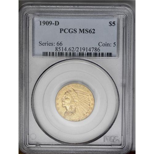 <B>1909-D<$5> MS62 PCGS.</B></I> The surfaces are smooth and satiny, with strong details and mild abrasions. The straw-gold coloration is very light, and includes some faint greenish undertones.
