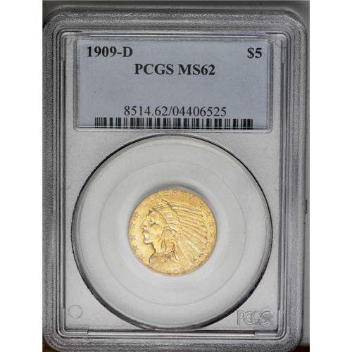 <B>1909-D<$5> MS62 PCGS.</B></I> Unusually deep apricot-gold toning evenly covers the smooth, lustrous surfaces. Well struck with two or three small abrasions on each side that define the grade.