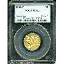 1909-D $5 MS62 PCGS. Very sharp detail with somewh <B>1909-D $5 MS62 PCGS.</B></I> Very sharp detail with somewhat muted luster. A few ticks are noted on the Indian's face, and a few more in the reverse fields. <BR><BR><B>Important notice:</B> Heritage usually auctions material at the rate of 200-250 lots per hour. On some occasions eBay Live bid software or the Internet may not be able to keep up with the pace of the auction. We recommend placing a realistic absentee bid now as insurance to avoid disappointment. Occasionally the auctioneer may eliminate or reject an eBay Live bid, and the auctioneer may also reopen a lot after the close of the eBay live bidding (usually because we missed an audience bid), and may reject your bid even if it shows you as the winning bidder. By bidding via eBay Live, you agree that Heritage may award the lot to another bidder at its sole discretion under the circumstances described above or any other reasonable circumstances. Since eBay bids are not shown to us until we open the lot on the floor, we treat those bids just like floor bids. In most cases the floor responds before the eBay bid is presented to us, due to Internet lag time, so for consistency we have made it a policy that floor bids are always considered first over tie eBay live bids. Also please note that all Heritage lots purchased through eBay Live carry a 20% Buyer's Premium. Please make sure you read the Terms and Conditions before you bid. This lot is being auctioned in conjunction with a live floor auction by Heritage Galleries & Auctioneers. All final auction and invoice information will be supplied by Heritage Galleries & Auctioneers, and all other information should be considered preliminary. Lot:6700