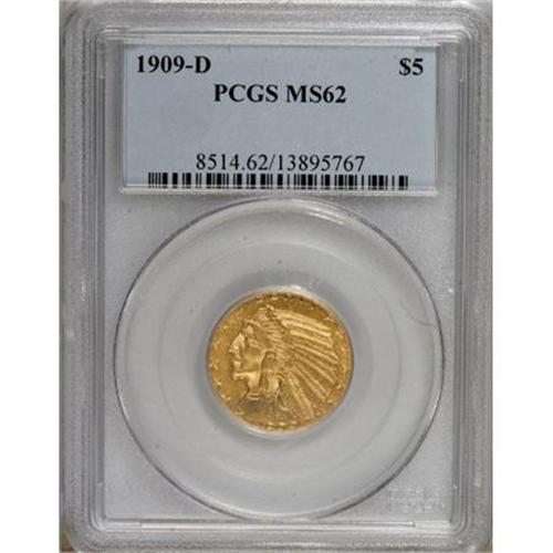 <B>1909-D $5 MS62 PCGS.</B></I> Satiny and nicely preserved with smooth, matte-like fields and sharply struck devices. Only trivial marks on the reverse limit the grade. This Indian Head half eagle issue is the one most often used for type purposes. <BR><BR><b>Shipping:</b> Coins & Currency (<a target="_blank" href="http://www.heritageauctions.com/common/shipping.php">view shipping information</a>)