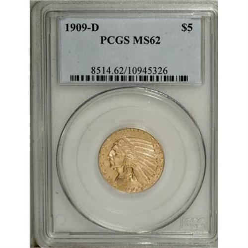 <B>1909-D $5 MS62 PCGS.</B></I> The luminous apricot-gold surfaces exhibit elements of orange. An unworn example of this ever-present Indian half eagle issue that shows pleasing central detail, though the lowest pendant is soft and both sides display a number of abrasions. Still, suitable for a similarly graded type set.<BR><BR><B>Coin Engraver:</B> Bela Lyon Pratt<BR><BR><b>Shipping:</b> Coins & Currency (<a target="_blank" href="http://www.heritageauctions.com/common/shipping.php">view shipping information</a>)