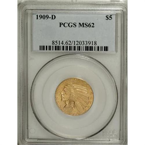 <B>1909-D $5 MS62 PCGS.</B></I> PCGS Population (7436/9907). NGC Census: (7443/7629). Mintage: 3,423,560. Numismedia Wsl. Price for NGC/PCGS coin in MS62: $900. (#8514)<BR><BR><B>Coin Engraver:</B> Bela Lyon Pratt<BR><BR><b>Shipping:</b> Coins & Currency (<a target="_blank" href="http://www.heritageauctions.com/common/shipping.php">view shipping information</a>)