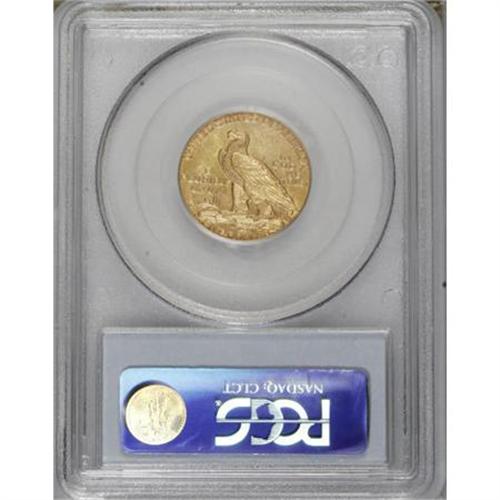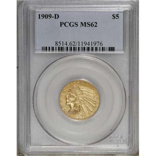 <B>1909-D $5 MS62 PCGS.</B></I> . PCGS Population (7742/10089). NGC Census: (7658/7798). Mintage: 3,423,560. Numismedia Wsl. Price for NGC/PCGS coin in MS62: $905. (#8514)<BR><BR><B>Coin Engraver:</B> Bela Lyon Pratt<BR><BR><b>Shipping:</b> Coins & Currency (<a target="_blank" href="http://www.heritageauctions.com/common/shipping.php">view shipping information</a>)