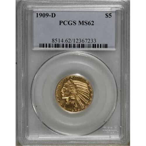 <B>1909-D $5 MS62 PCGS.</B></I> PCGS Population (7841/10145). NGC Census: (7705/7871). Mintage: 3,423,560. Numismedia Wsl. Price for NGC/PCGS coin in MS62: $910. (#8514)<BR><BR><B>Coin Engraver:</B> Bela Lyon Pratt<BR><BR><b>Shipping:</b> Coins & Currency (<a target="_blank" href="http://www.heritageauctions.com/common/shipping.php">view shipping information</a>)