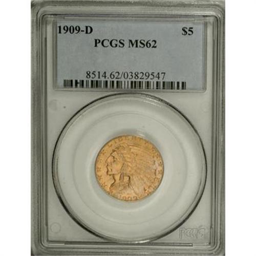<B>1909-D $5 MS62 PCGS.</B></I> PCGS Population (7851/10149). NGC Census: (7705/7871). Mintage: 3,423,560. Numismedia Wsl. Price for NGC/PCGS coin in MS62: $910. (#8514)<BR><BR><B>Coin Engraver:</B> Bela Lyon Pratt<BR><BR><b>Shipping:</b> Coins & Currency (<a target="_blank" href="http://www.heritageauctions.com/common/shipping.php">view shipping information</a>)