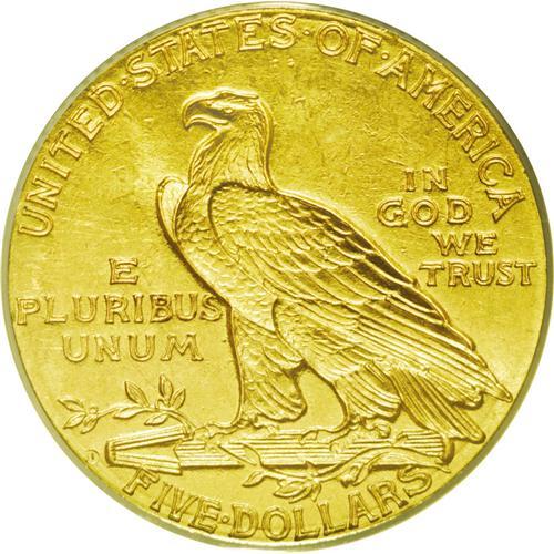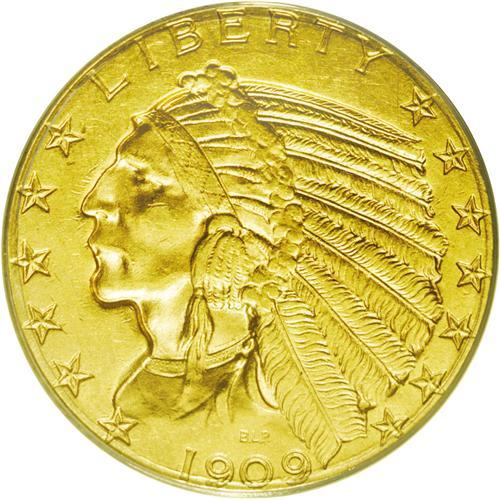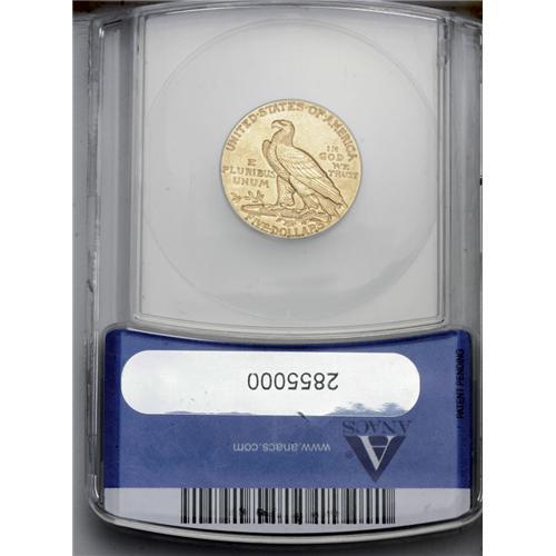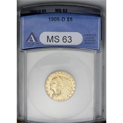<B>1909-D<$5> MS63 ANACS.</B></I> The design elements are sharply struck on this copper-gold colored D-mint issue. A few small marks are noted in the left obverse and in the upper right reverse fields. A highly collectible type coin.