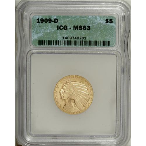 <B>1909-D $5 MS63 ICG.</B></I> Suitably struck for this issue with lustrous maize-gold surfaces that pale slightly in the center. Scattered marks appear on both sides, and a significant abrasion is noted in the field above the eagle.<BR><BR><b>Shipping:</b> Coin/Currency (<a target="_blank" href="http://www.heritageauctions.com/common/shipping.php">view shipping information</a>)
