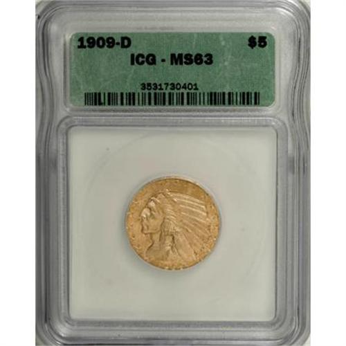 <B>1909-D $5 MS63 ICG.</B></I> A well struck example of this widely collected Indian half eagle type issue, predominantly yellow-orange with apricot accents on the lustrous obverse. Faint, scattered abrasions define the grade.<BR><BR><B>Coin Engraver:</B> Bela Lyon Pratt<BR><BR><b>Shipping:</b> Coins & Currency (<a target="_blank" href="http://www.heritageauctions.com/common/shipping.php">view shipping information</a>)