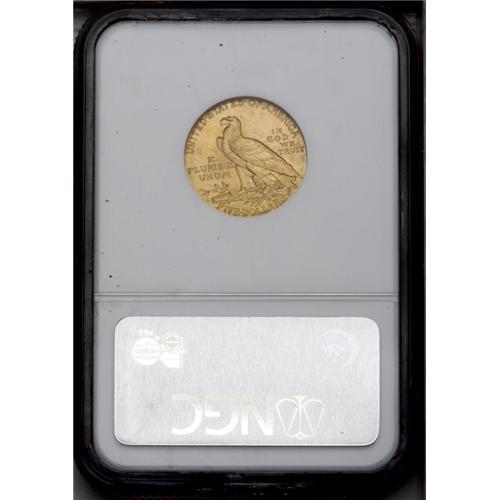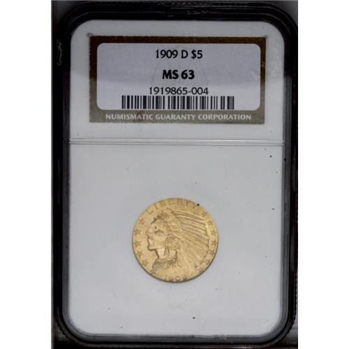 <B>1909-D<$5> MS63 NGC.</B></I> A boldly struck reddish-golden representative that has an attractive obverse and a moderate abrasion above the eagle's wing on the reverse. <BR><BR><B>Important notice:</B> Heritage usually auctions material at the rate of 200-250 lots per hour. On some occasions eBay Live bid software or the Internet may not be able to keep up with the pace of the auction. We recommend placing a realistic absentee bid now as insurance to avoid disappointment. Occasionally the auctioneer may eliminate or reject an eBay Live bid, and the auctioneer may also reopen a lot after the close of the eBay live bidding (usually because we missed an audience bid), and may reject your bid even if it shows you as the winning bidder. By bidding via eBay Live, you agree that Heritage may award the lot to another bidder at its sole discretion under the circumstances described above or any other reasonable circumstances. Since eBay bids are not shown to us until we open the lot on the floor, we treat those bids just like floor bids. In most cases the floor responds before the eBay bid is presented to us, due to Internet lag time, so for consistency we have made it a policy that floor bids are always considered first over tie eBay live bids. Also please note that all Heritage lots purchased through eBay Live carry a 20% Buyer's Premium. Please make sure you read the Terms and Conditions before you bid. This lot is being auctioned in conjunction with a live floor auction by Heritage Galleries & Auctioneers. All final auction and invoice information will be supplied by Heritage Galleries & Auctioneers, and all other information should be considered preliminary. Lot:2872 <BR><BR><B>Winning Notification and Billing:</B> After the FINAL session in this auction is complete, Heritage will send e-mail and snail mail invoices. This process normally takes several days. All final auction and invoice information will be supplied by Heritage Galleries & Auctioneers, and all other information should be considered preliminary. <BR><BR>This auction will be conducted on a live auction floor and over the Internet through eBay Live. If you choose to place an absentee bid, please take a moment to <font color='#0000ff'><u><a href='http://pages.ebay.com/liveauctions/help/before/laabsentee.html'>learn how eBay Live absentee bidding works</a></u></font><font color='#000000'>