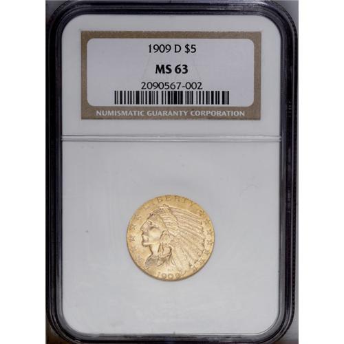 <B>1909-D $5 MS63 NGC.</B></I> A lovely type coin that sizzles with bright mint frost over a finely textured matte-like surface. This is an enchanting coin that should please anyone looking for good value in this difficult type. Well struck.