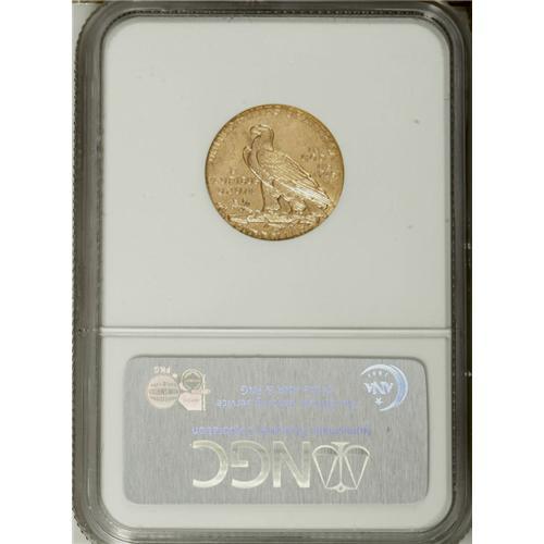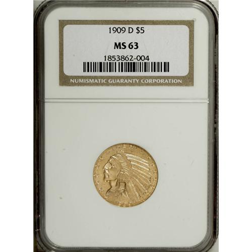 <B>1909-D $5 MS63 NGC.</B></I> The common date of this popular series, this example exudes warmth and radiance. Sharply struck and fully brilliant, this specimen is a perfect candidate for any uncirculated gold type collection.<BR><BR><b>Shipping:</b> Coin/Currency (<a target="_blank" href="http://www.heritageauctions.com/common/shipping.php">view shipping information</a>)