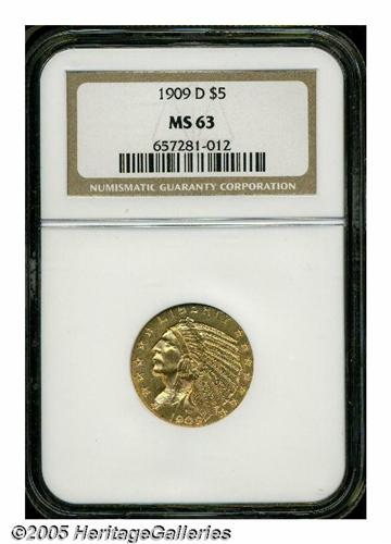 1909-D $5 MS63 NGC. Well struck and lustrous, wit