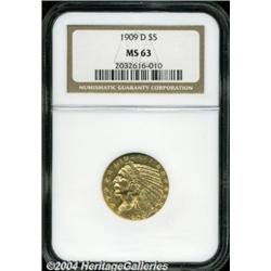 <B>1909-D<$5> MS63 NGC.</B></I> Fully struck with bright mint luster and a significant overlay of reddish patina. <BR><BR><B>Important notice:</B> Heritage usually auctions material at the rate of 200-250 lots per hour. On some occasions eBay Live bid software or the Internet may not be able to keep up with the pace of the auction. We recommend placing a realistic absentee bid now as insurance to avoid disappointment. Occasionally the auctioneer may eliminate or reject an eBay Live bid, and the auctioneer may also reopen a lot after the close of the eBay live bidding (usually because we missed an audience bid), and may reject your bid even if it shows you as the winning bidder. By bidding via eBay Live, you agree that Heritage may award the lot to another bidder at its sole discretion under the circumstances described above or any other reasonable circumstances. Since eBay bids are not shown to us until we open the lot on the floor, we treat those bids just like floor bids. In most cases the floor responds before the eBay bid is presented to us, due to Internet lag time, so for consistency we have made it a policy that floor bids are always considered first over tie eBay live bids. Also please note that all Heritage lots purchased through eBay Live carry a 20% Buyer's Premium. Please make sure you read the Terms and Conditions before you bid.